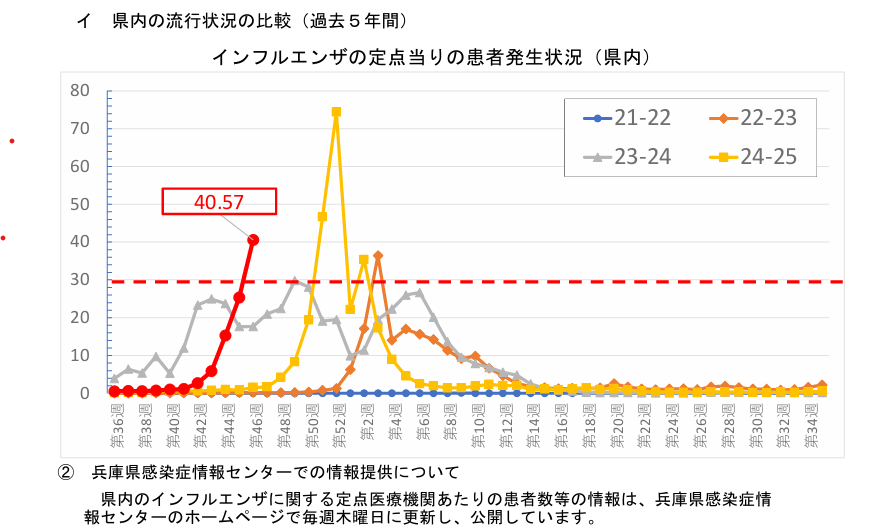 兵庫県の定点観測で40.57人と警報の30人どころか40人越えです。